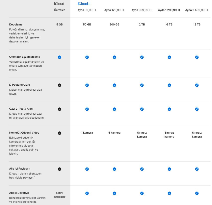 iCloud+ aboneleri için ise farklı depolama seçenekleri mevcut: 50 GB, 200 GB, 2 TB, 6 TB ve 12 TB.